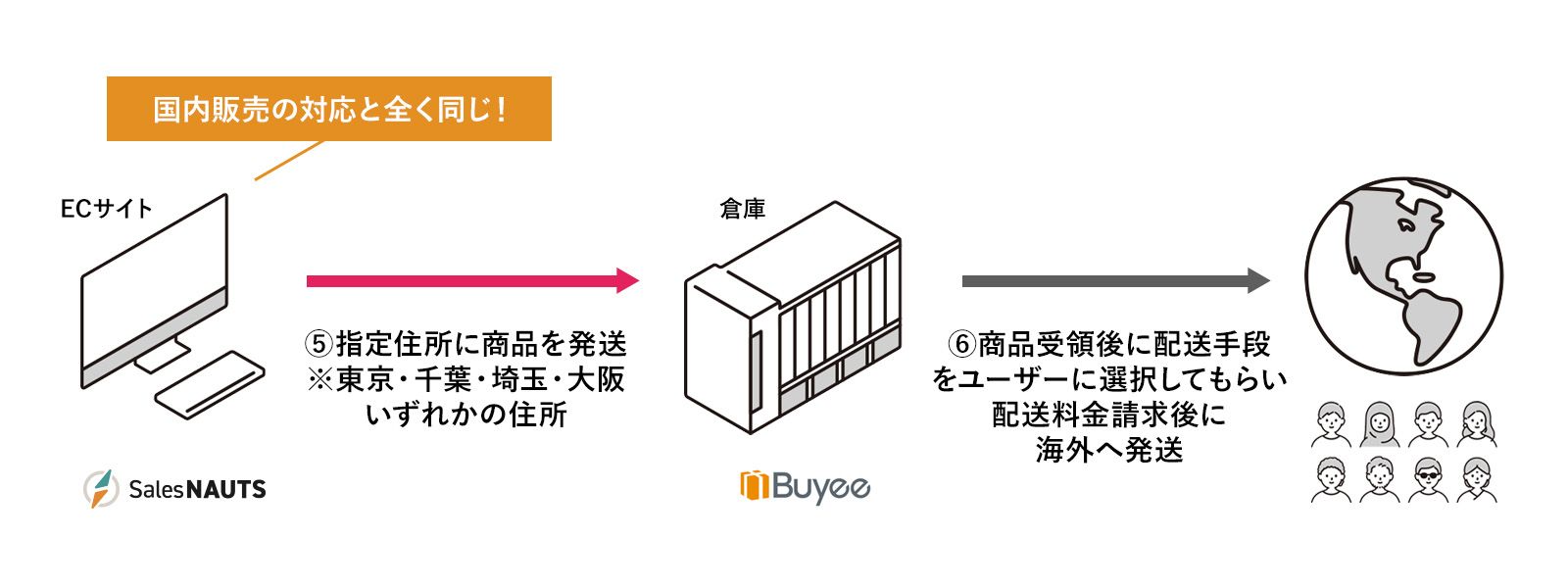 越境EC対応ツール「Buyee Connect」を導入することで「Salesnauts」で海外通販が可能となります。「Buyee Connect」は他社の越境ECサービスとは異なり、海外通販においてショップ側にかかる費用や発送作業、他言語でのお客様対応などの負担が一切ありません。